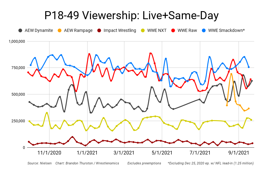 Information on Smackdowns partial preemption was addedWWE Smackdown Friday on Fox was watched by 1927000 viewers on average including about 574000 aged 18 to 49 for a 044 P18-49 ratingAEW Rampage preempted on TNT at 8 pm was watched by 528000 viewers on average including about 222000 for a 017 P18-49 ratingWith Smackdown. Here are some notes to keep in mind when looking at the numbers. Plus Rampage airs at 10 pm.